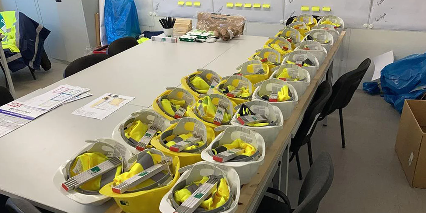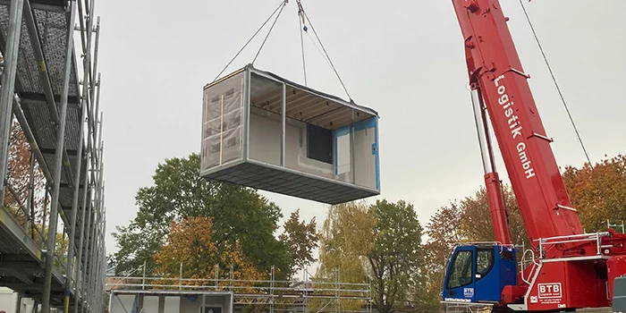 Zum Ende des dritten Bauabschnitts haben uns einige Schülerinnen und Schüler mit ihren Lehrkräften einen Besuch auf der Baustelle abgestattet und das wachsende Gebäude bestaunt. Langsam, aber sicher neigt sich die Montage dem Ende zu und die vier Geschosse vervollständigen sich. Noch braucht es für die Kleinen einiges an Vorstellungskraft, in einigen Wochen – mit Voranschreiten des Innenausbaus – werden die Unterrichtsräume allerdings schnell Gestalt annehmen. Einige Tage später war statt strahlend blauem Himmel der erste Winter eingebrochen – dank der hohen Vorfertigung der Module konnten wir uns aber über die ersten Flocken freuen und die Montage fortsetzen.