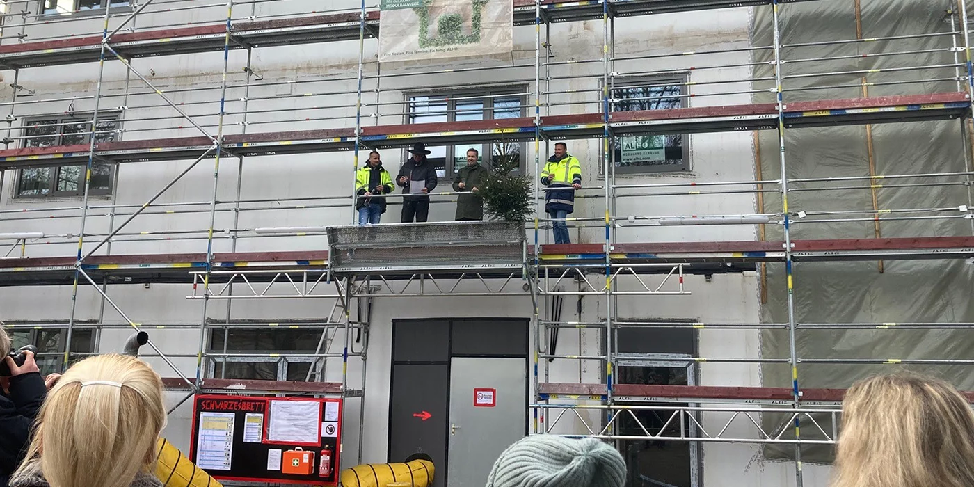 Kurz vor den Weihnachtsfeiertagen versammelten sich die Projektbeteiligten, stellvertretend für ALHO waren Pascal Schalles, Leiter der Niederlassung Ost, und Bauleiter Jan Rößler vor Ort auf der Baustelle in Pankow. Gemeinsam mit Sören Benn, Bezirksbürgermeister von Pankow, wurde als gebührender Jahresabschluss des Projektes das Richtfest gefeiert und auf einen weiteren, reibungslosen Projektablauf angestoßen.