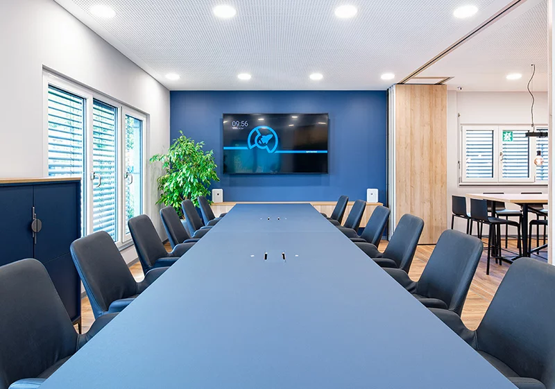 Bis dahin können die Mitarbeiter rund 650 qm Quadratmeter als Arbeits- und Aufenthaltsfläche nutzen – überwiegend großzügige Open-Space-Büros, in denen sich kreativ und innovativ denken, arbeiten und besprechen lässt. Dazu gibt es noch einen Küchen- und Kantinenbereich, der – mittels mobiler Trennwand – einem 35 qm großen Besprechungsraum zugeschlagen werden kann. Für Veranstaltungen und Feste stehen dann fast 60 qm Fläche zur Verfügung.