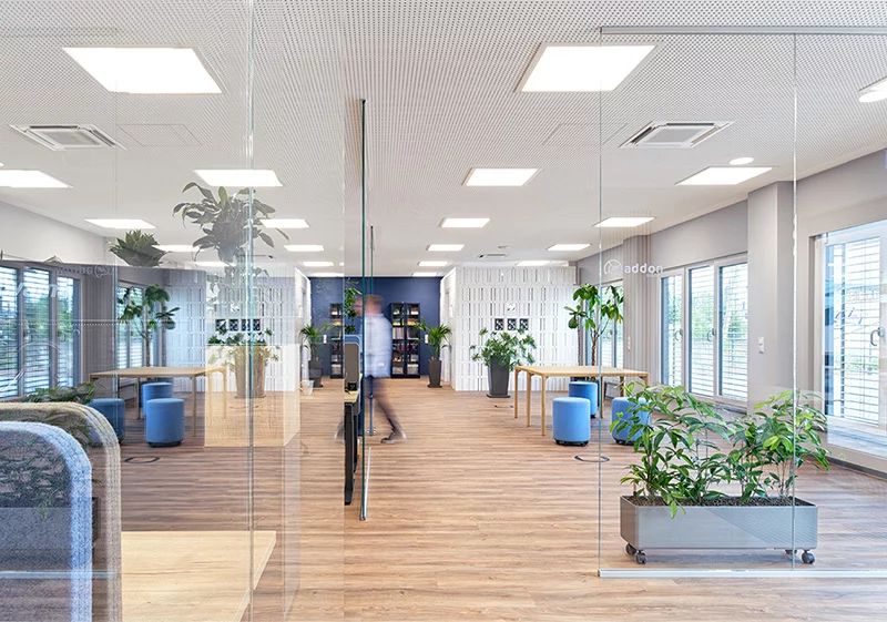 Wert legte Ingo Faulstich auf eine insgesamt stimmige Ausstattung und hochwertige Details im Gebäude, wie die pflegeleichten und strapazierfähigen Design-Vinylböden in Holzoptik oder die dreiläufige Stahltreppe mit Betonstufen. Akustikdecken sorgen in allen Büroräumen für eine angenehm ruhige Arbeitsatmosphäre.