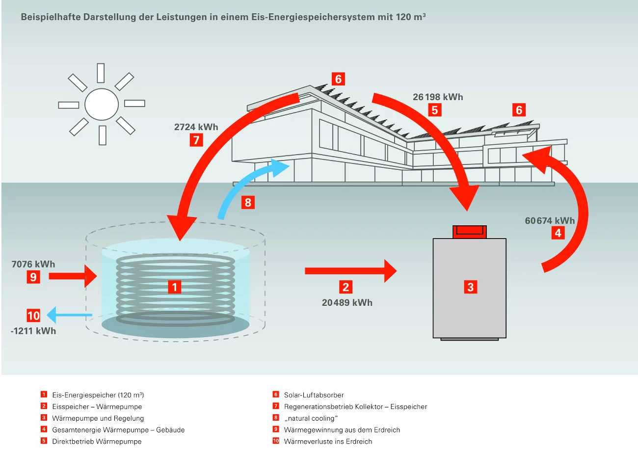 Wasser als Speichermedium ist hierbei höchst wirtschaftlich, denn der im Eisspeicher ablaufende Prozess des Gefrierens – der sogenannte „Regenerationsprozess“ - kann nahezu endlos wiederholt und die Energie somit unbegrenzt nutzbar gemacht werden. Neben der Wirtschaftlichkeit punktet der Eis-Energiespeicher durch seine Nachhaltigkeit, denn er arbeitet im Gegensatz zu konservativen Heizmethoden ohne die Verbrennung von fossilen Brennstoffen.