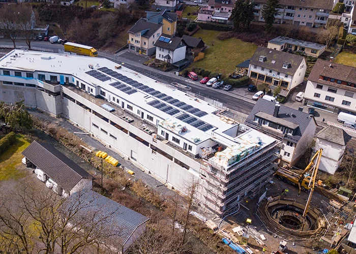 ALHO hat diese regenerative Art der Energieerzeugung zum Heizen und Kühlen erstmals bei einem Modulbau-Projekt erfolgreich eingesetzt. Beim Neubau des Fachmarktzentrums Morsbach handelt es sich um ein dreigeschossiges Gebäude, das Einkaufen, Arbeiten und Wohnen auf einer Gesamtfläche von 5.424 qm unter einem Dach vereint. Dort kommt eine Kombination von Eisspeicher, Wärmepumpe und Solarkollektoren zum Einsatz.