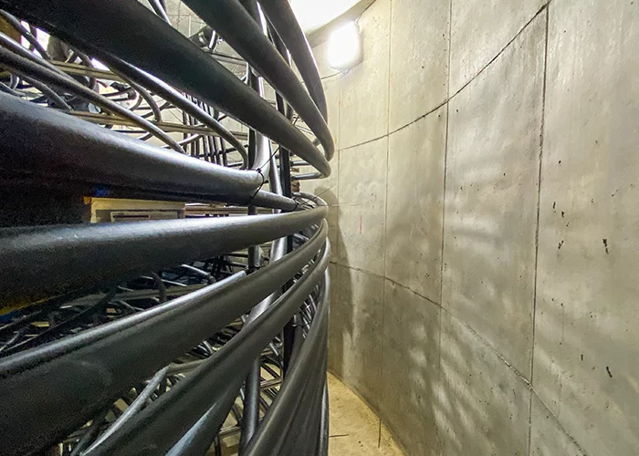 Um zu verstehen, wie der Eis-Energiespeicher funktioniert, klären wir zunächst dessen Aufbau. Am Anfang des Systems sitzt ein unterirdischer Betontank, der mit Wasser gefüllt und über eine Rohrwendel ähnlich einem Tauchsieder mit der Wärmepumpe verbunden ist. Der Gefrierprozess des Wassers läuft von innen nach außen ab, dabei wird sogenannte Kristallisationswärme freigesetzt – das Wasser gibt also seine Energie ab und leitet diese an eine Wärmepumpe weiter.