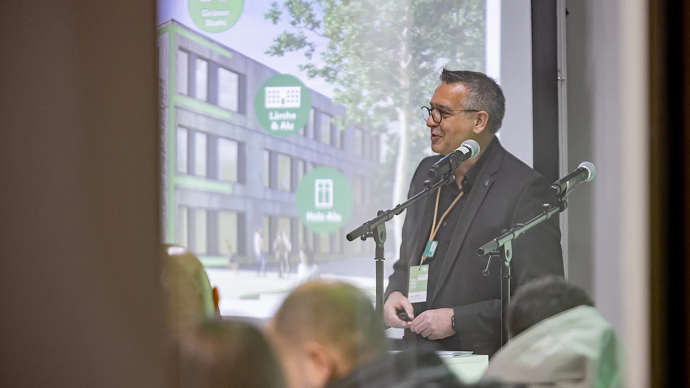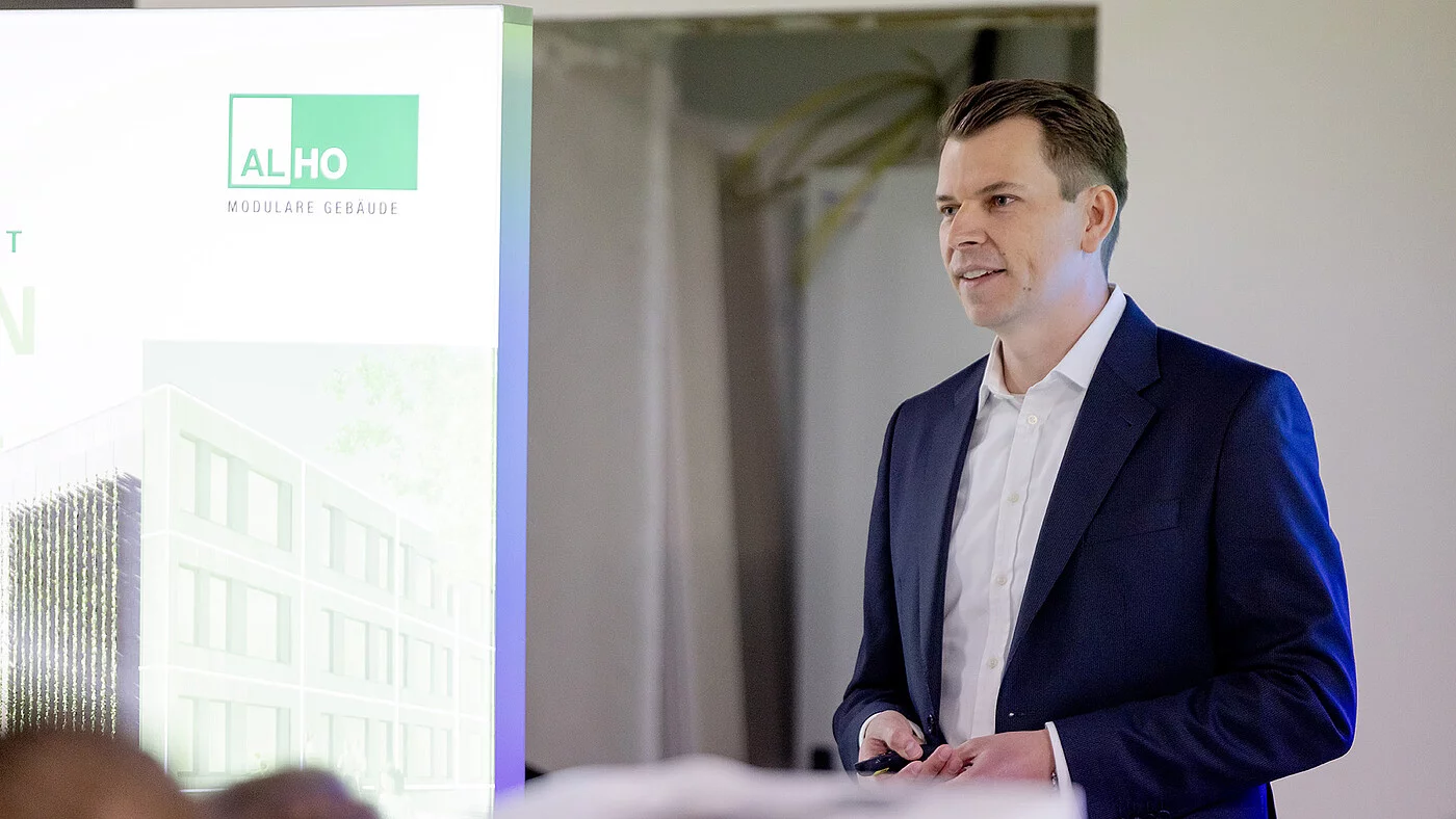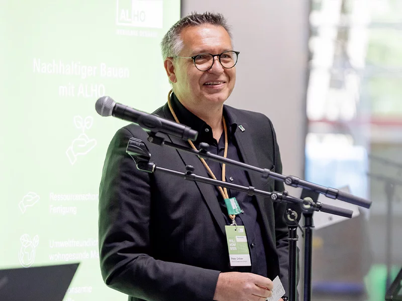 ALHO Geschäftsführer Peter Orthen bekräftigte in seinem Vortrag, wie wichtig konsequent ehrliches und transparentes Handeln ist, um die gesetzten Klimaziele bis 2050 zu erreichen – in vielen Industriebereichen und besonders in der Baubranche. „Kreislaufwirtschaft ist mehr als Dosenpfand, und Nachhaltigkeit mehr als das Vorhängen einer Holzfassade“, sagte der Geschäftsführer. „Modulbau aber ist gelebte Nachhaltigkeit“, betonte Orthen und wies neben der ressourcenschonenden Produktion in der ALHO Raumfabrik vor allem auf die „cradle-to-cradle“-Fähigkeit der modernen Stahlmodulbauweise hin, die mit einer Baustahl-Recyclingquote von bis zu 99% andere Bauweisen weit in den Schatten stellt.