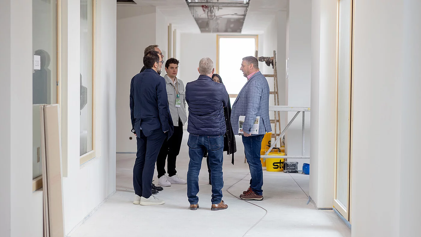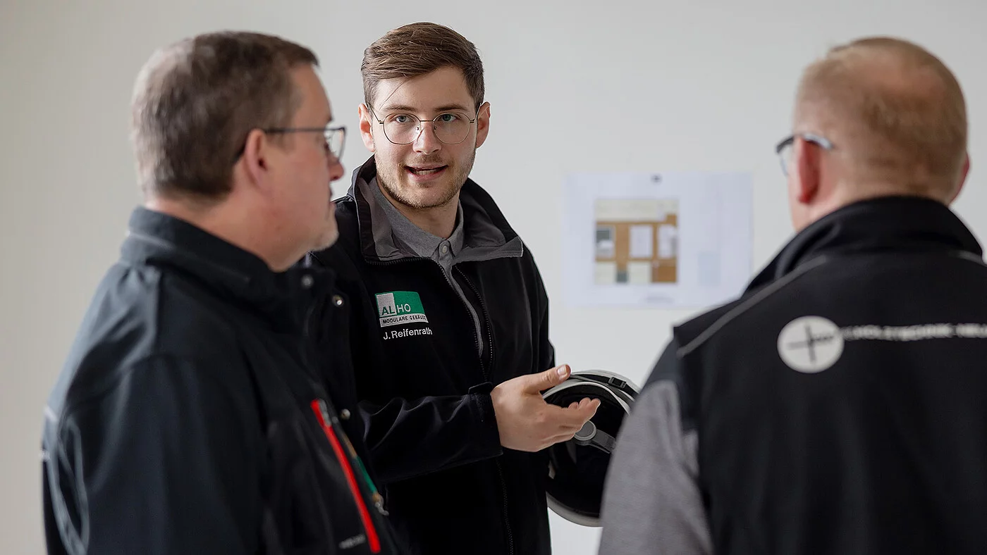 Nach der thematischen Einstimmung in den Vorträgen, konnten die Besucher aufgeteilt in Gruppen einen Rundgang durch das Gebäude machen. Dabei wurden sie von Sebastian Trautermann, ALHO Geschäftsstellenleiter Rhein-Ruhr, und Daniel Maag, Niederlassungsleiter West, begleitet, die das Gebäude aus dem Effeff kennen. Auch die für den Entwurf der nach dem Clusterprinzip konzipierten Schule verantwortlichen Architekten Julian Stratmann und Christian Wiese von der futur.drei Planer GmbH standen für Fragen bereit.