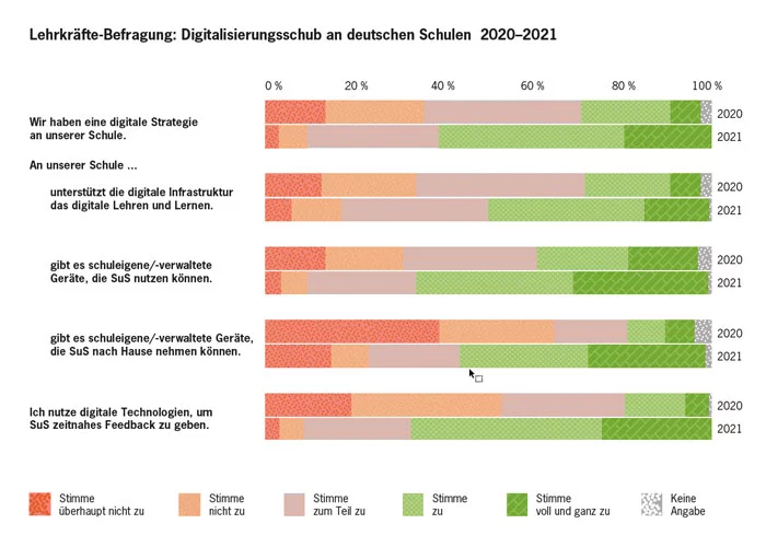 Digitales Lernen soll Normalität werden in Deutschland, um Medienkompetenz und Chancengleichheit quer durch alle Einkommensschichten zu schaffen. Doch erst jetzt – nach einem schleppenden Anlauf, Klagen über bürokratische Hürden und dem pandemiebedingten Fiasko des Home-Schoolings – scheint der DigitalPakt in der Praxis anzukommen. Die Ergebnisse einer repräsentativen Digitalisierungsstudie der Universität Göttingen, die im Juni 2021 vorgestellt wurde, geben Anlass zu vorsichtigem Optimismus: Während 2020 nur 27 Prozent der befragten Lehrkräfte von einer erkennbaren digitalen Schulstrategie berichteten, hat sich dieser Anteil bis März 2021 mehr als verdoppelt. Bei Computern stieg die Verfügbarkeit von 36 auf 65 Prozent – bei Endgeräten, die zum Lernen auch mit nach Hause genommen werden können, sogar von 15 auf 55 Prozent.