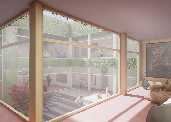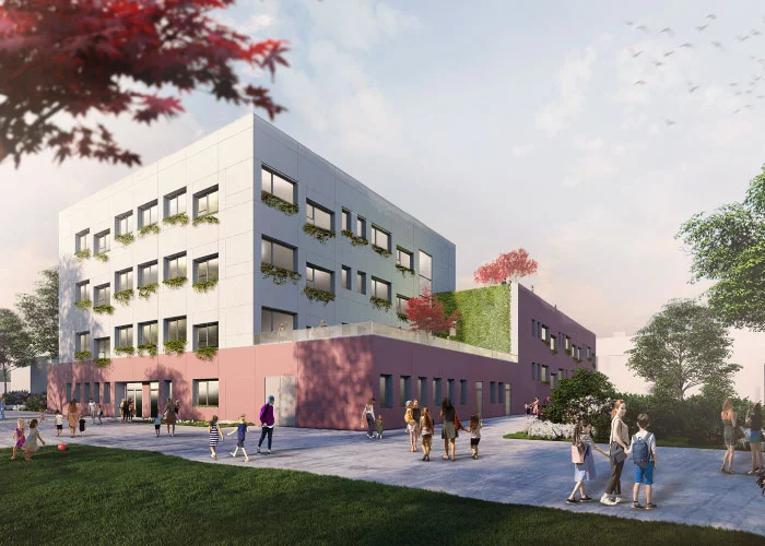 Vorbildcharakter soll hier die inklusive Berswordt-Europa-Grundschule Dortmund haben. ALHO arbeitet bei diesem Projekt mit einem auf Schulen spezialisierten Kölner Architekturbüro zusammen. Elementarer Bestandteil des Konzepts ist ein behagliches Ambiente mit viel Licht, natürlichen Materialien und warmen Farben, denn nur wer sich wohlfühlt, ist motiviert zu lernen. Großflächige Verglasungen schaffen weite Sichtachsen sorgen für lichtdurchflutete Räume, Offenheit und Transparenz und stärken so stärken das Gemeinschaftsgefühl. Im Erdgeschoss sind ein Forum, eine Mensa und ein schön gestalteter Gemeinschaftsbereich über einen atriumartigen Innenhof mit vertikaler Begrünung verbunden.