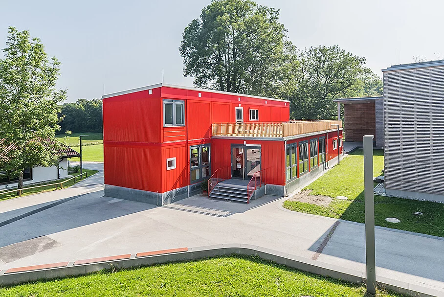 Im April noch waren die 15 FAGSI-Container der Baureihe ProLife in München auf der bauma im Einsatz, wenig später standen sie bereits – aufbereitet, umgestaltet und durch neun weitere Container ergänzt – als zweigeschossige Schulbibliothek in Starnberg.