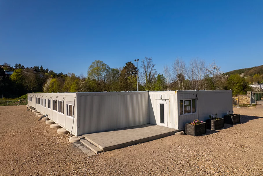 Die 3.000 qm große Interims-Schulanlage, bestehend aus 183-Mietcontainern wurde Anfang 2022 fertiggestellt.