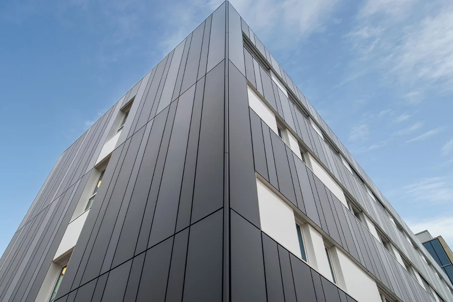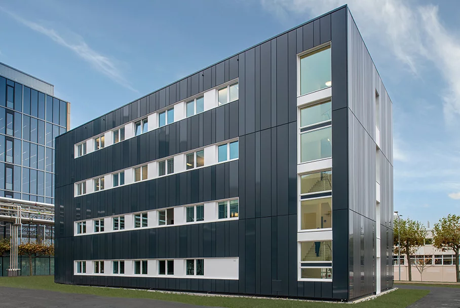 Eine weitere klassische Vorgabe beim Bauen mit Merck ist auch die Ausführung einer nicht brennbaren Fassadenverkleidung. Die Planer entschieden sich darum für eine hinterlüftete Vorhangfassade aus glatten, unterschiedlich breiten Aluminiumkassetten in edlen, dunklen Anthrazit-Tönen. Das Wärmedämmgefälledach wurde als Gründach ausgebildet und bietet so einen ökologischen Ausgleich zu der durch die Bebauung versiegelten Bodenfläche.
