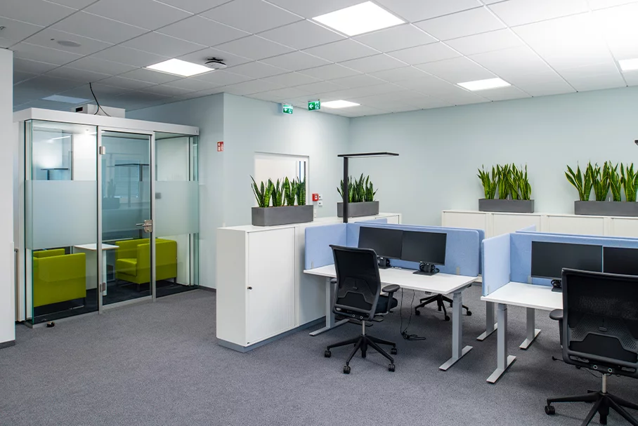 In der Werk- und Ausführungsplanung hatte ALHO den Architektenentwurf an die Raster- und Modulmaße in Höhe und Breite anzupassen, spezielle Sicherheits- und Zugangssysteme zu integrieren, eine ganze Reihe weiterer Merck-interner Planungsvorgaben zu beachten sowie den EnEV-Nachweis zu führen. Auch galt es, hohe bauphysikalische Auflagen bezüglich des Schall- und Brandschutzes umzusetzen. Gerade in Großraumbüros und Open Spaces sind Schallschutz und Raumakustik ein wichtiges Thema, dem sich die Modulbauweise systembedingt bereits mit besten bauphysikalischen Werten stellt.