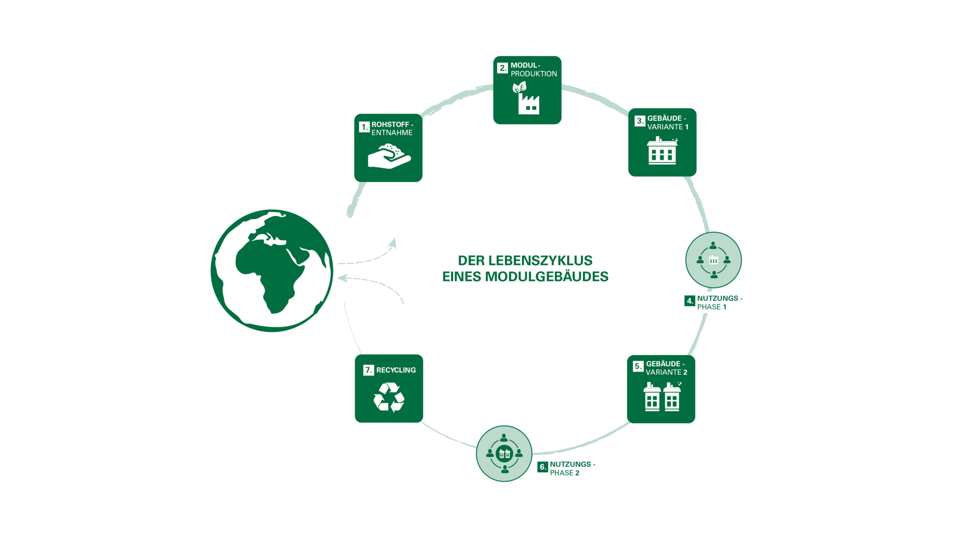 Die ALHO Modulbauweise zeichnet sich durch enorme Qualitätsansprüche an ein nachhaltiges und zukunftsfähiges Produkt aus, das schon jetzt Maßstäbe im Bauwesen hinsichtlich Ressourcenschonung, Zero Waste und einer Kreislaufwirtschaft nach dem Cradle to Cradle-Prinzip setzt. Ein bedeutender Nachhaltigkeitsfaktor liegt allein schon im System der vorgefertigten Raumtragwerke begründet, aus denen sich Modulgebäude zusammensetzen. Dank ihrer freitragenden Stahlskelettstruktur mit nichttragenden Innenwänden sind sie sehr flexibel und können umgestaltet, vergrößert, verkleinert oder umgewidmet und somit immer wieder an einen veränderten Bedarf – auch im Nachhinein – angepasst werden. Damit stellen sie das konventionelle Bauen deutlich in den Schatten.