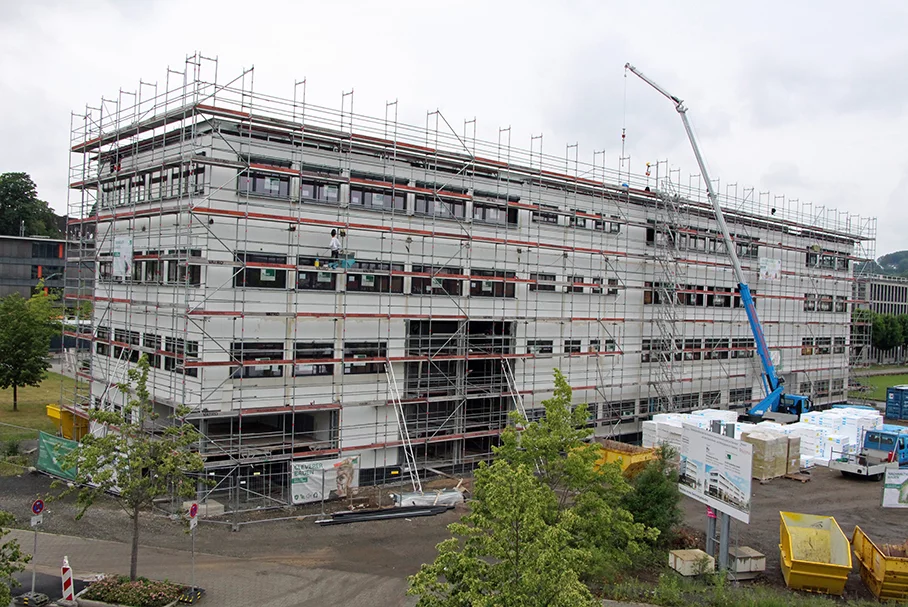 Drei Wochen nach Montagebeginn der Raummodule für die Erweiterung der Akademie Gesundheitswirtschaft und Senioren (AGewiS) auf dem Steinmüllergelände in Gummersbach steht der veredelte Rohbau.