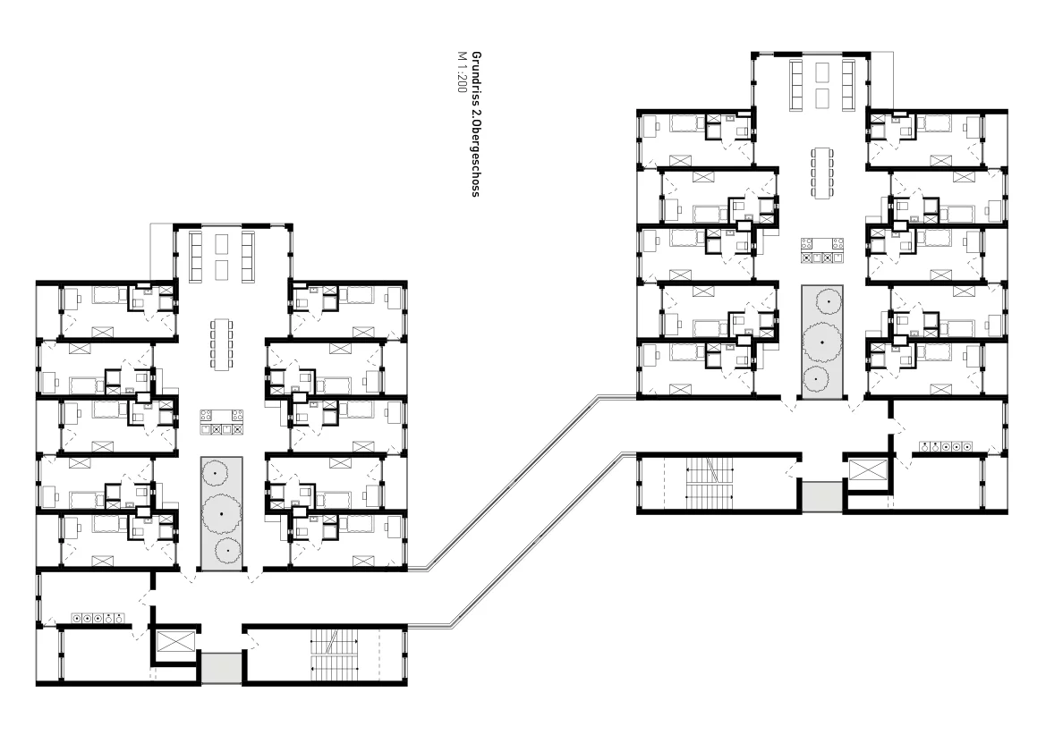 Am anderen Ende des Gemeinschaftsraums sorgt ein durch alle Stockwerke verlaufender, begrünter Lichtschacht für weiteren Tageslichteinfall, so dass tagsüber keine zusätzlichen Lichtquellen benötigt werden – ein Baustein in Sachen Wirtschaftlichkeit. Komplettiert wird das Raumprogramm durch einen Wasch-Trockenraum und einen Raum zum gemeinschaftlichen Lernen.