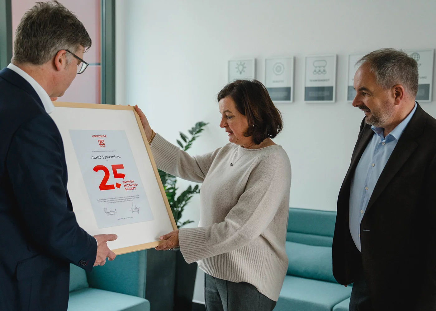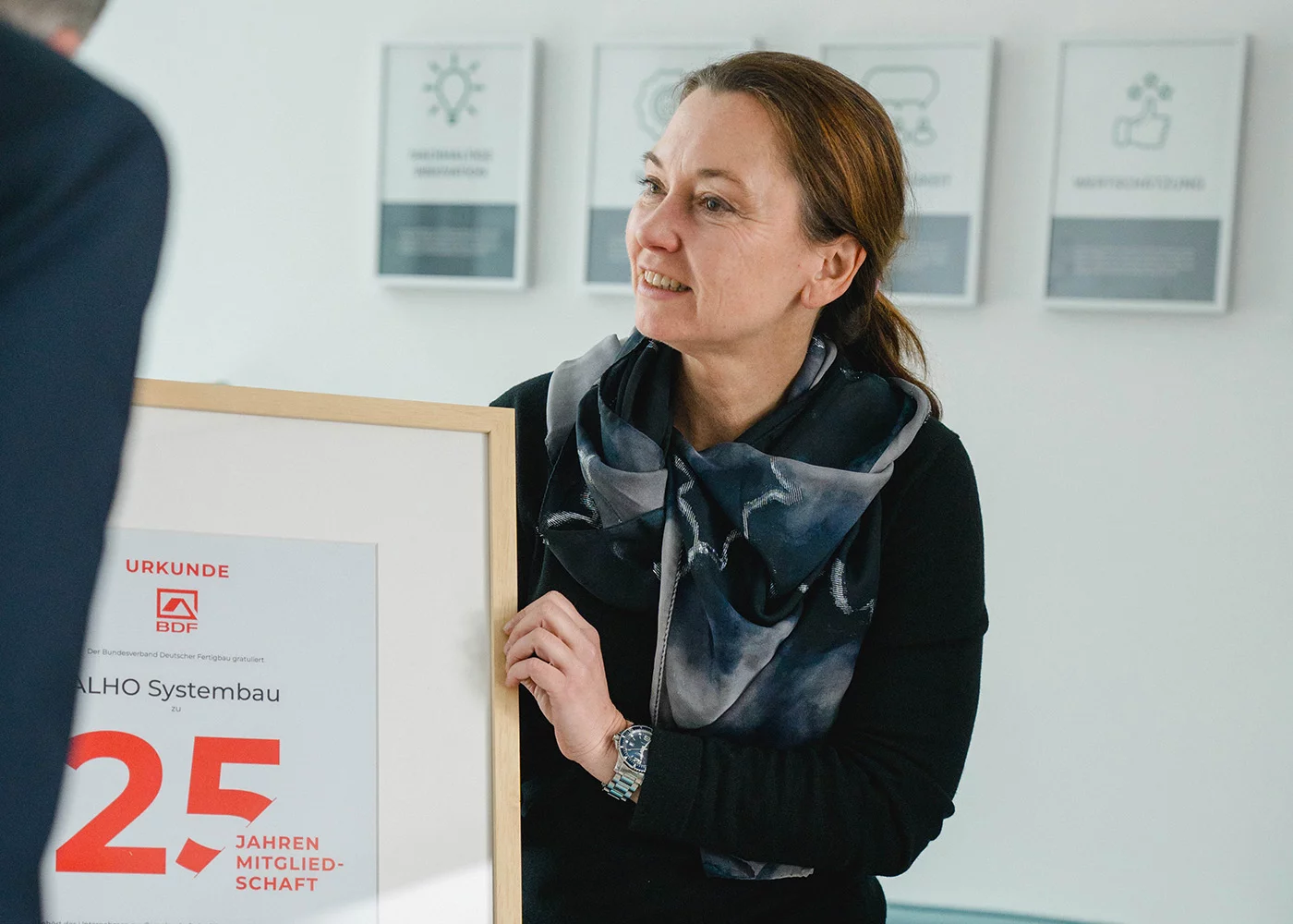 Anlässlich unserer 25-jährigen Mitgliedschaft durften wir BDF-Geschäftsführer Georg Lange in Friesenhagen begrüßen. Im Namen der ALHO Inhaberfamilie nahmen Silvia Matschke und Achim Holschbach und der Geschäftsführung der ALHO Holding, Dr. Nicole Steinmetz, die Urkunde entgegen.