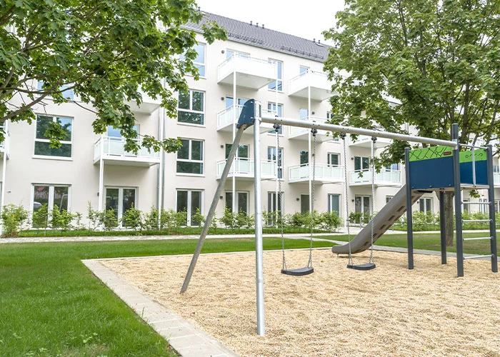 Unterschiedliche Trauf- und Sockelhöhen lassen die einzelnen Gebäudeeinheiten wie aneinandergereihte Einzelhäuser wirken und die rund 130 Meter lange Häuserzeile somit kleinteiliger erscheinen. Hier sind 62 Zwei-, Drei-, Vier- und Fünfzimmerwohnungen untergebracht. 29 Wohnungen sind barrierefrei konzipiert. Im Erdgeschoss verfügen die Wohnungen über Gärten, alle anderen haben Balkone mit Blick ins Grüne. Spielflächen sowie Stellplätze für Fahrräder und PKWs befinden sich in den mieterfreundlich gestalteten Außenanlagen.