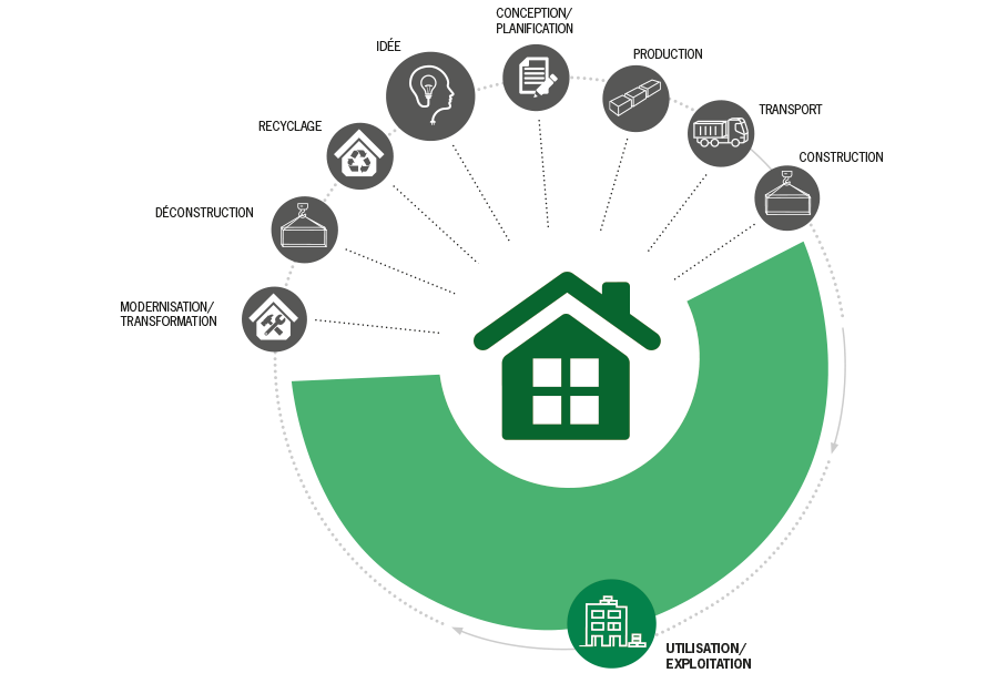 L'approvisionnement et la fabrication des matériaux de production ainsi que la construction et la déconstruction d'un bâtiment contribuent également à une charge d'énergie négative avec un potentiel d'effet de serre considérable : il s'agit de l'énergie appelée « grise ». C'est pourquoi il est important de considérer si un bâtiment peut être réutilisé facilement et si ses composants peuvent être recyclés et réutilisés. Et cela dépend du mode de construction et des matériaux employés. C'est ici que le cycle de vie d'un bâtiment entre en jeu. L'analyse du cycle de vie permet d'établir un bilan des effets sur l'environnement et des coûts durant toutes les phases de la durée de vie d'un bâtiment de manière globale, de l'extraction des matières premières, en passant par la fabrication du produit, l'utilisation, l'entretien, la modernisation, la destruction et la déconstruction jusqu'au recyclage. Concepteurs, architectes et maîtres d'ouvrage bénéficient ainsi d'informations sur la qualité réelle d'un bâtiment sur l'ensemble de son cycle de vie. En fonction du mode de construction et du type de bâtiment, la durée de vie d'un bâtiment, qui est définie selon le principe du « berceau au berceau », se situe entre 20 et 50 ans. Comparée à d'autres biens d'investissement, c'est une durée plutôt longue et il faut donc poser au plus tôt les jalons conduisants au développement de bâtiments durables.