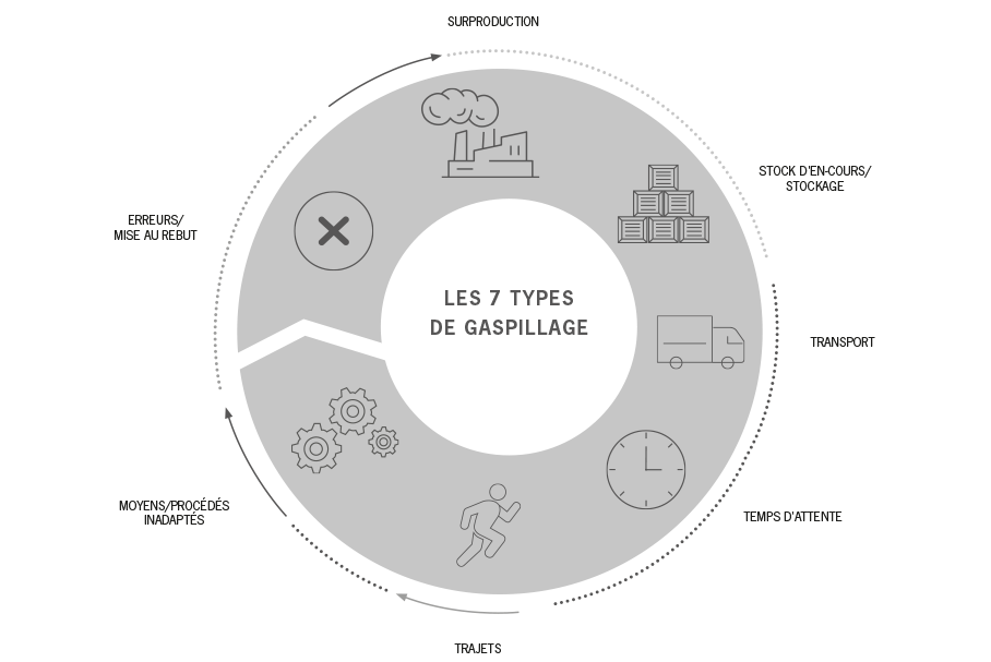 En ce qui concerne les erreurs, il est facile de comprendre que la mise au rebut ou le travail supplémentaire dû au manque de qualité qui en résulte sont du gaspillage. Si un réusinage est encore possible, la création de valeurs est alors seulement en partie gaspillée – mais dans le cas de la mise au rebut, totalement gaspillée.